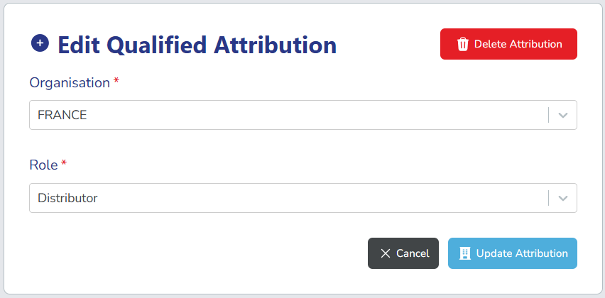 - Editors add attribution entries to datasets to specify organisations and their roles