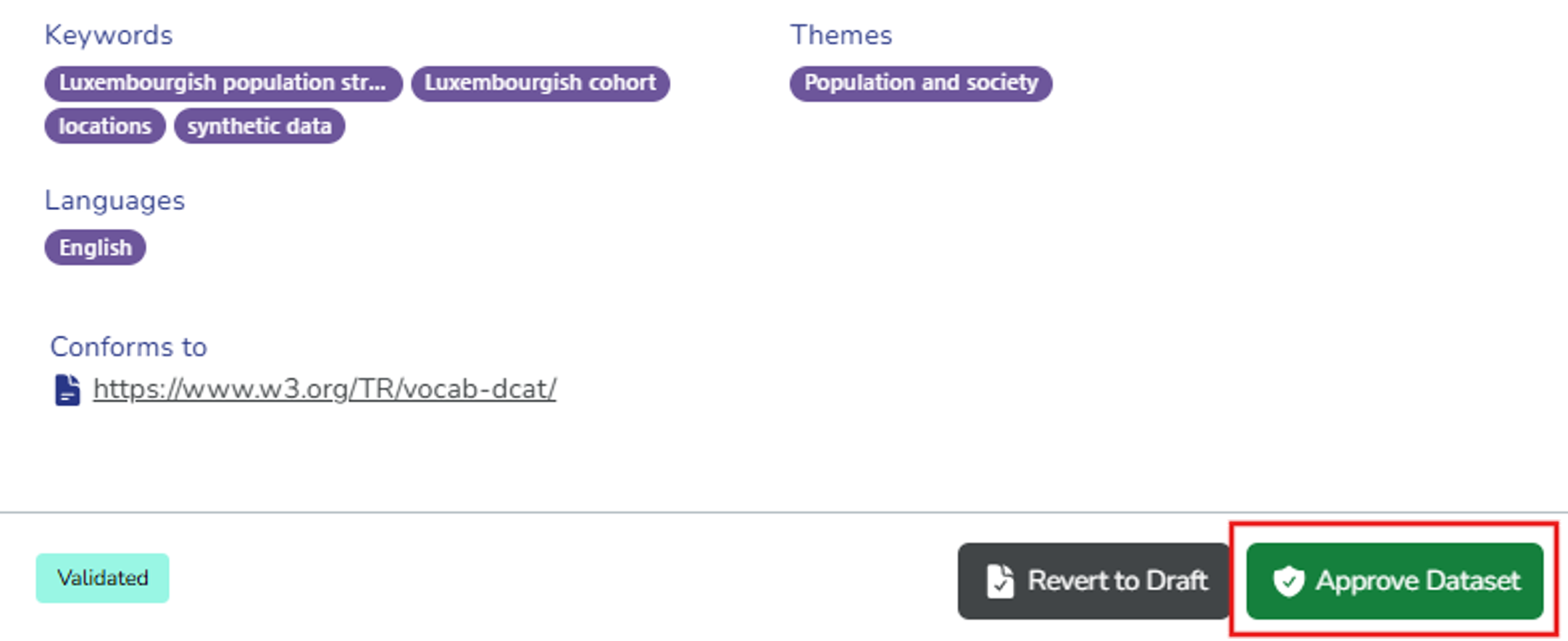 Select Approve Dataset again to confirm approval. After the dataset is approved, it appears in the Approved tab and is ready for publication.