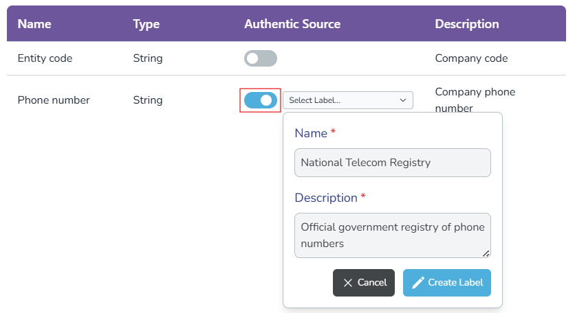 Select the toggle under the Authentic Source column of the field you want to assign an authentic source to. The label field for entering the authentic source appears.