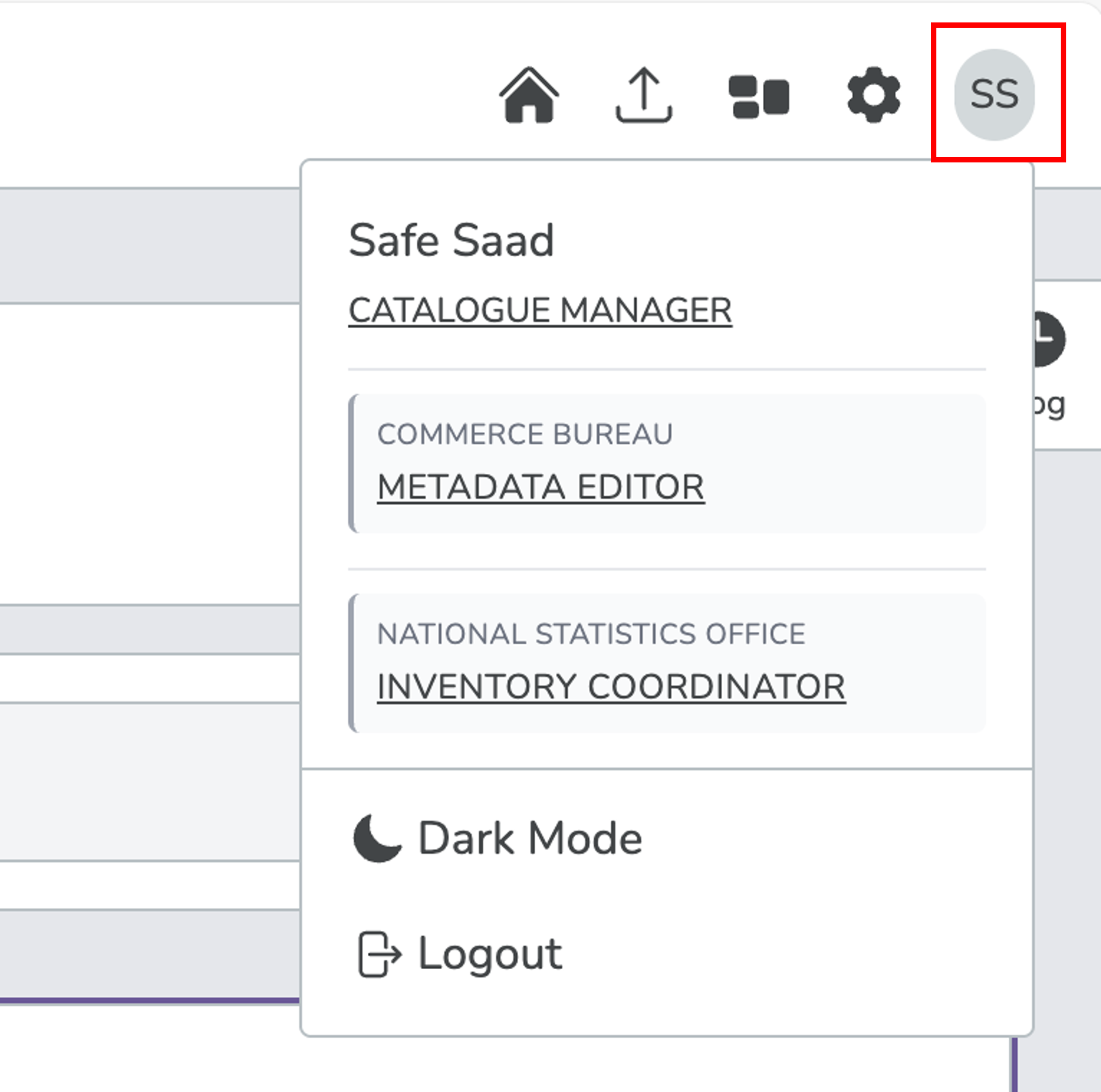 In this example, the user is part of two organisations: Commerce Bureau and National Statistics Office, and is also a Catalogue Manager in both organisations.
