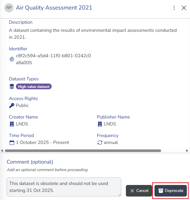 Deprecate datasets that are no longer relevant or accurate. Deprecation indicates to users that the dataset should not be used for new analyses, while still preserving its historical context for reference. Use this option when datasets have been superseded by newer versions or when their content is outdated. To understand the dataset lifecycle, see the dataset workflow.