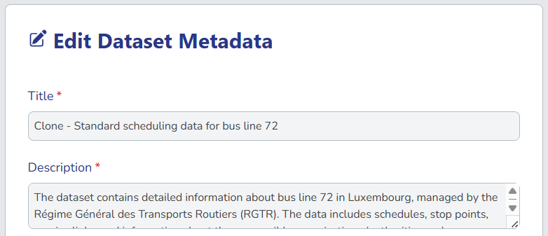 - All metadata fields: Title with "Clone -" prefix, description, temporal coverage, etc.
